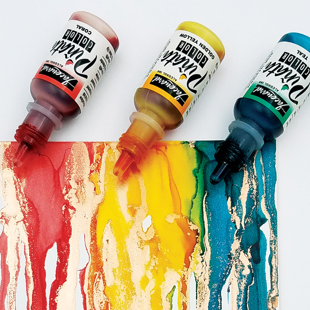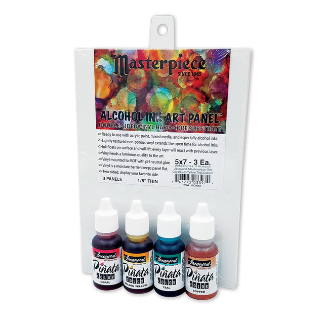 - This set includes 3 x 12,7x17,8 cm Masterpiece® Alcohol Ink Art Panels™ and 4 x 14.79 ml bottles of Piñata Alcohol Inks with the following colors: 004 Golden Yellow, 008 Coral, 020 Teal, 034 Copper;