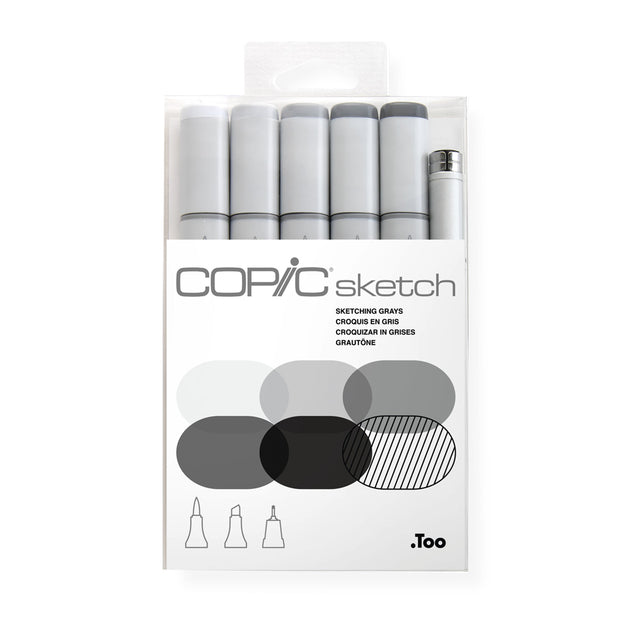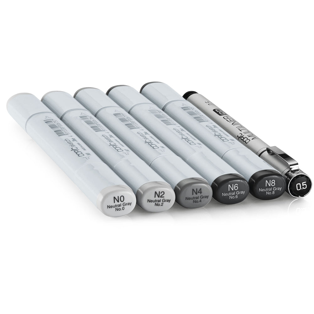 - This 6 piece Sketching Grays set includes a combination of neutral gray colours N0, N2, N4, N6, N8 and a black 0.5 Multiliner SP pen;