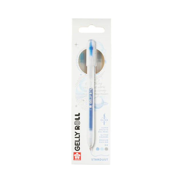- This set consists of 3 retractable gel pens with glittering stardust blue, sky blue and silver ink;