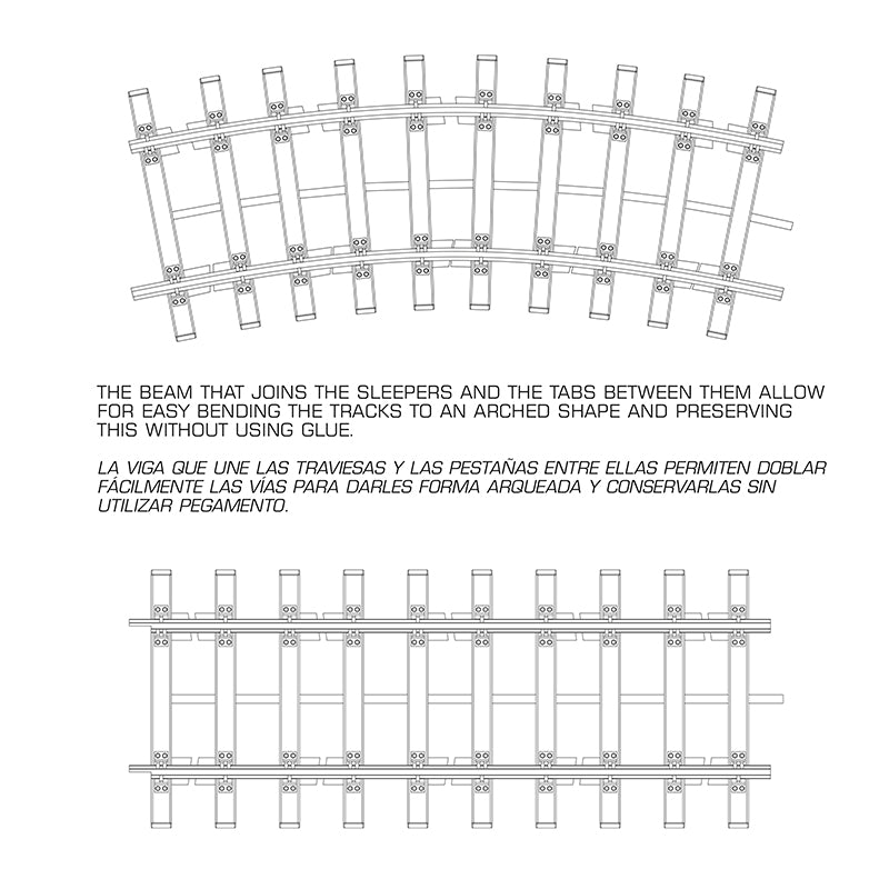 - The beam that joins the sleepers and the tabs between them allow for easy bending the tracks to an arched shape and preserving this without using glue.